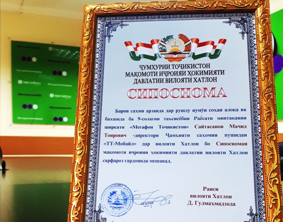 Для регионального управления компании «МегаФон Таджикистан» по Хатлонской области новый год начался с награды за большой вклад в развитие связи в регионе. Подпись под благодарственным письмом оператору поставил председатель Хатлонской области Гулмахмадзода Давлатшох.