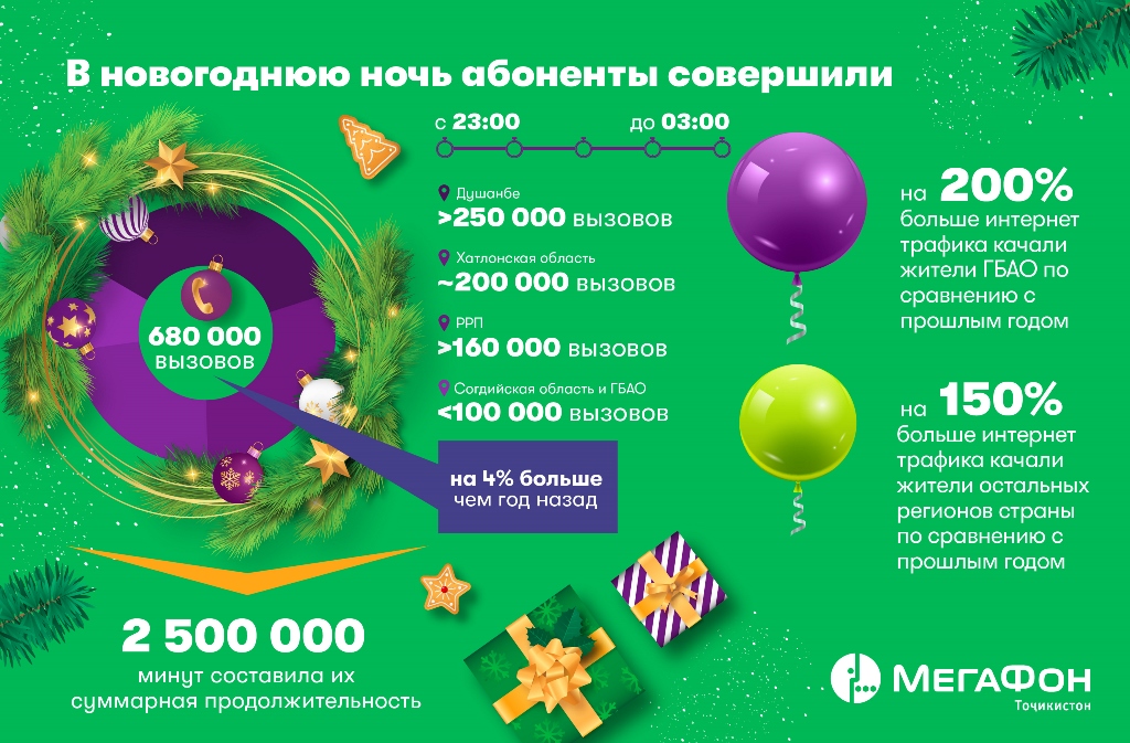 «Итоги новогодней ночи показывают, что наши абоненты все чаще предпочитают традиционным услугам – звонкам и SMS – поздравления в интернете, в социальных сетях и мессенджерах. Причем установить новый «цифровой» рекорд активно помогали жители тех населенных пунктов Таджикистана, где услуга мобильной передачи данных появилась сравнительно недавно. Наши клиенты быстро осваивают интернет, а значит, мы выбрали верную стратегию, строя сети новых поколений в районах и обеспечивая доступ к Всемирной сети даже в небольших селах республики», – комментирует Исполнительный директор компании «МегаФон Таджикистан» Анатолий Изюмников.