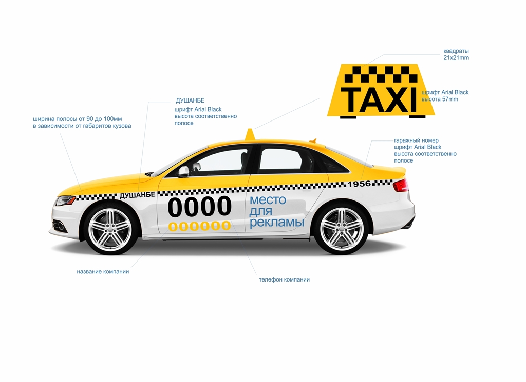 В соответствии с единым дизайном, верхняя часть такси должна быть окрашена в желтый цвет, нижняя часть автомобиля — в белый. На кузов должны быть нанесены цветографические схемы с шашечками и информация о перевозчике с номерами телефонов вызова такси и на задних дверях реклама.