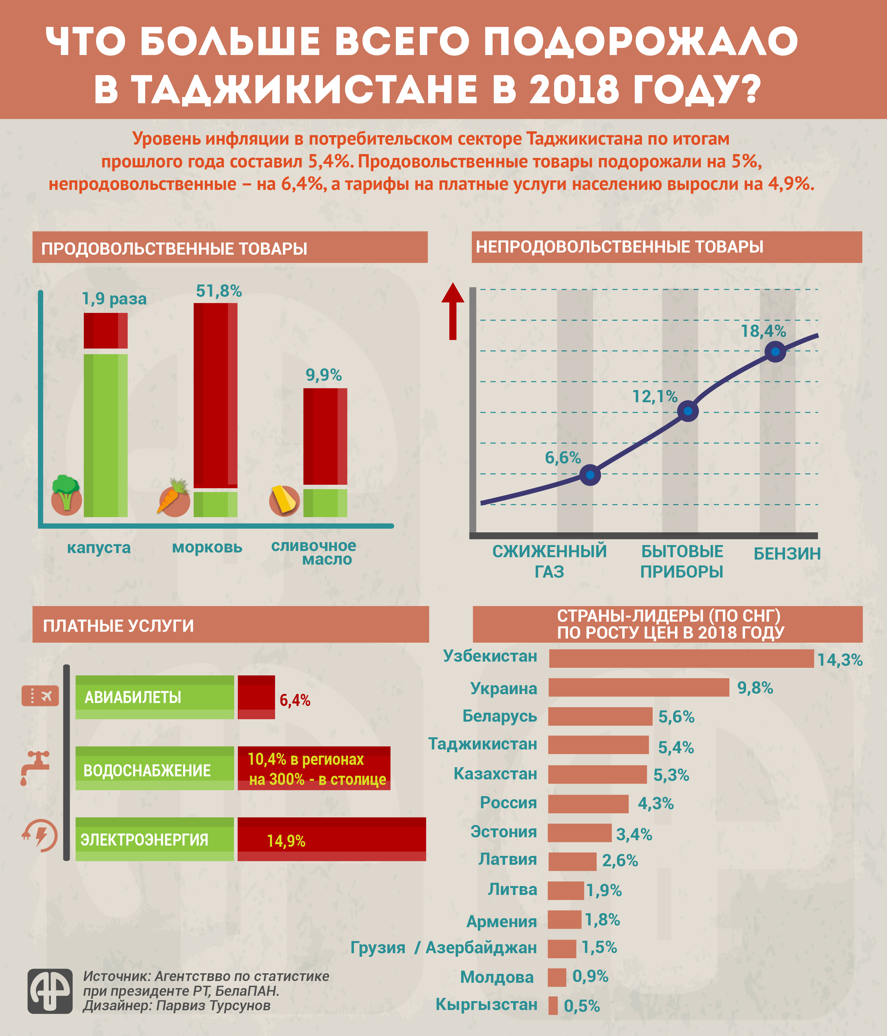 Уровень инфляции в потребительском секторе Таджикистана по итогам прошлого года составил 5,4%. Решили показать вам, что и на сколько больше всего подорожало в прошлом году.