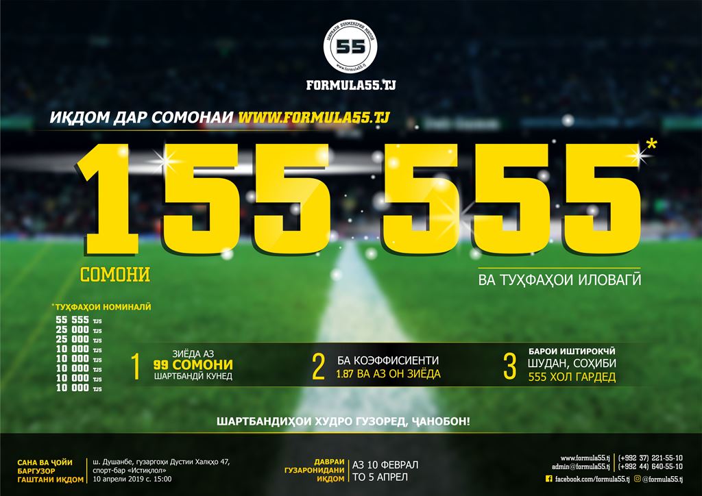 Букмекерская компания «Формула 55» запустила мега-акцию «Грандиозный марафон на 155 555 сомони». Акция проходит с 10 февраля по 5 апреля по всей республике. Победителей ждут щедрые призы.