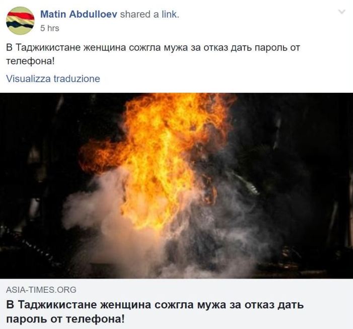 18 января в группе Tajik Mama Group на Facebook появилась информация о том, что «В Таджикистане женщина сожгла мужа за отказ дать пароль от телефона».