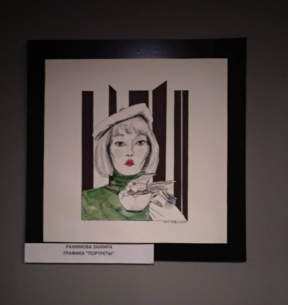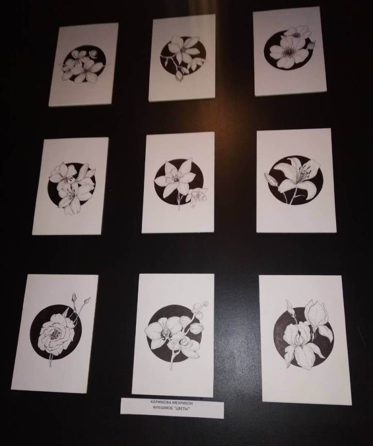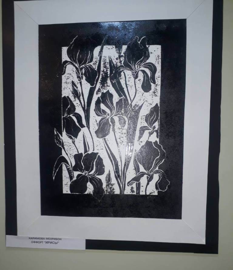 Всего на выставке была представлена 41 работа – это лишь малая часть того, что у них есть. Были представлены такие работы, как: Флешмоб «Цветы», Оффорт «Ирисы» (Мехрибон Каримова), Флешмоб «Портретный батл» (Насиба Каримова), Графика «Портреты» (Замира Рахимова), Чернильная графика «Городской пейзаж» (Абдурахмон Насриддинов) и другие.
