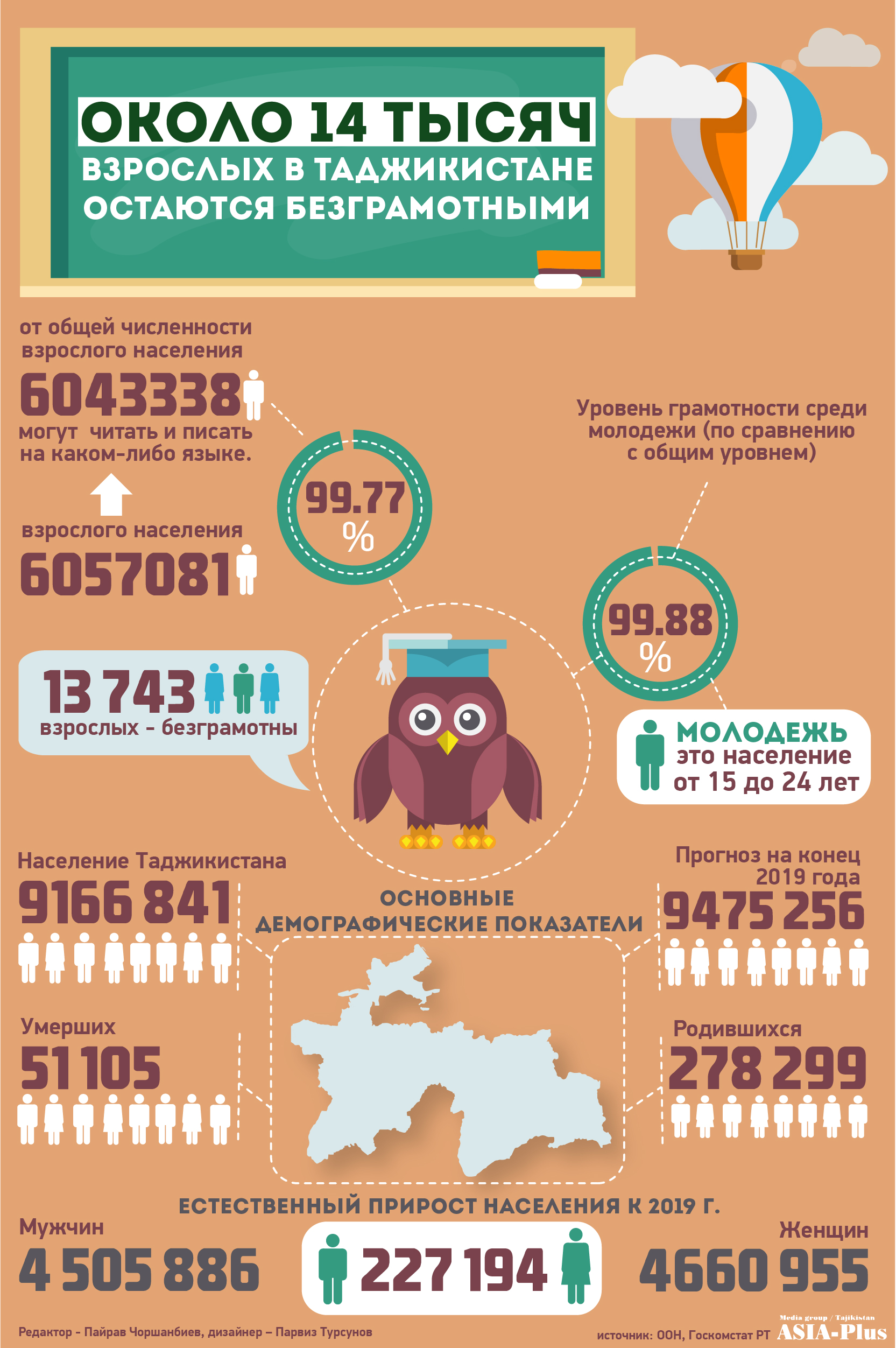 В Таджикистане более 99,77% или 6 млн. 43 тыс. 338 от общей численности взрослого населения (6 млн. 57 тыс. 81 человек) могут читать и писать на каком-либо языке.