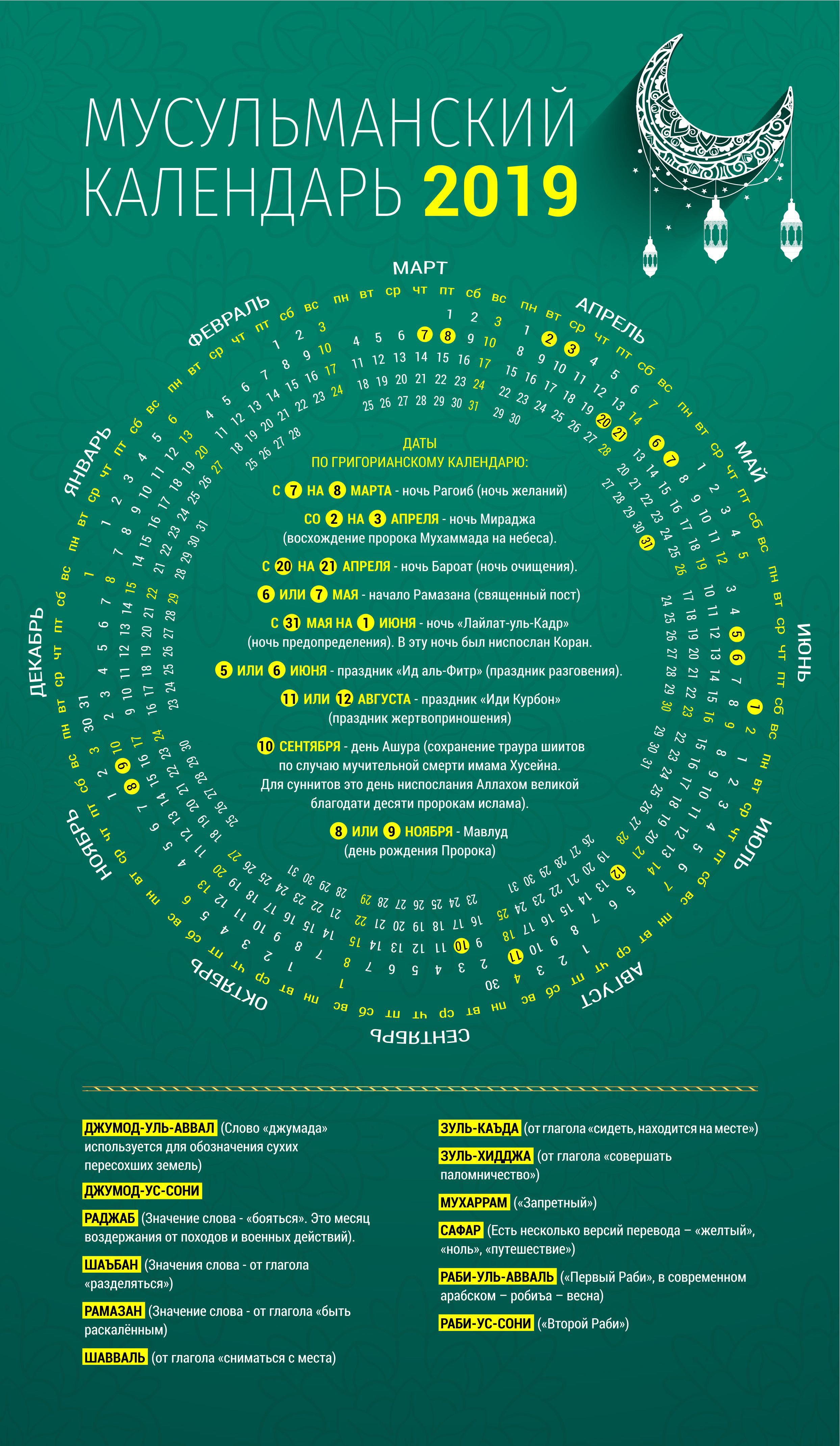 Предлагая вашему вниманию мусульманский календарь на 2019 год, напоминаем, что мусульманский год начинается не 1 января, а в день Хиджры, когда Пророк Мухаммед переселился из Мекки в Медину в 622 году нашей эры.