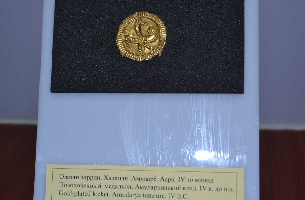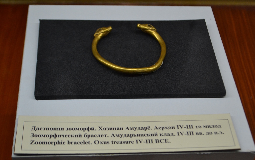 У двух витрин в отделе древней истории Национального музея Таджикистана посетители задерживаются надолго. Их внимание привлекают шесть уникальных изделий из так называемого «Амударьинского клада» — золотая четырёхугольная пластина, резная серебряная статуэтка, золотой диск для одежды, золотой округлый атрибут одежды, золотая декоративная круглая пластина и несомкнутый браслет с гладким, круглым в сечении обручем, наконечники которого обозначены в виде козлиных голов.
