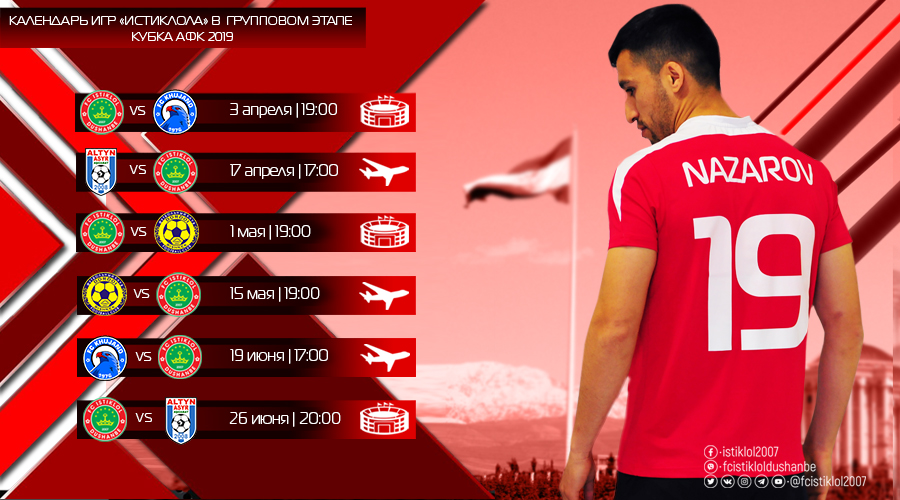 Напомним, что матч первого тура группового турнира Кубка АФК-2019 между двумя таджикскими клубами «Истиклол» ( Душанбе) — «Худжанд» (Худжанд) пройдет 3 апреля на Центральном республиканском стадионе Душанбе.