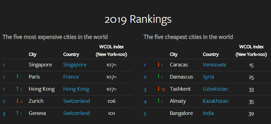 Исследовательская компания The Economist Intelligence Unit, специализирующаяся на экономическом прогнозировании, определила список самых дорогих и дешёвых городов для проживания в 2019 году, сообщает Spot. Исследование ежегодно проводится уже в течение 30 лет, пишет CA-NEWS.
