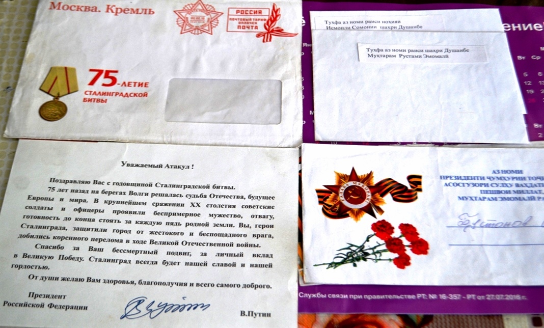 Он с гордостью показывает и письмо по случаю 75-летия Сталинградской битвы, подписанное президентом России Владимиром Путиным, в котором в частности говорится: «Спасибо за Ваш бессмертный подвиг, за личный вклад в Великую Победу! Сталинград всегда будет нашей славой и нашей гордостью!».