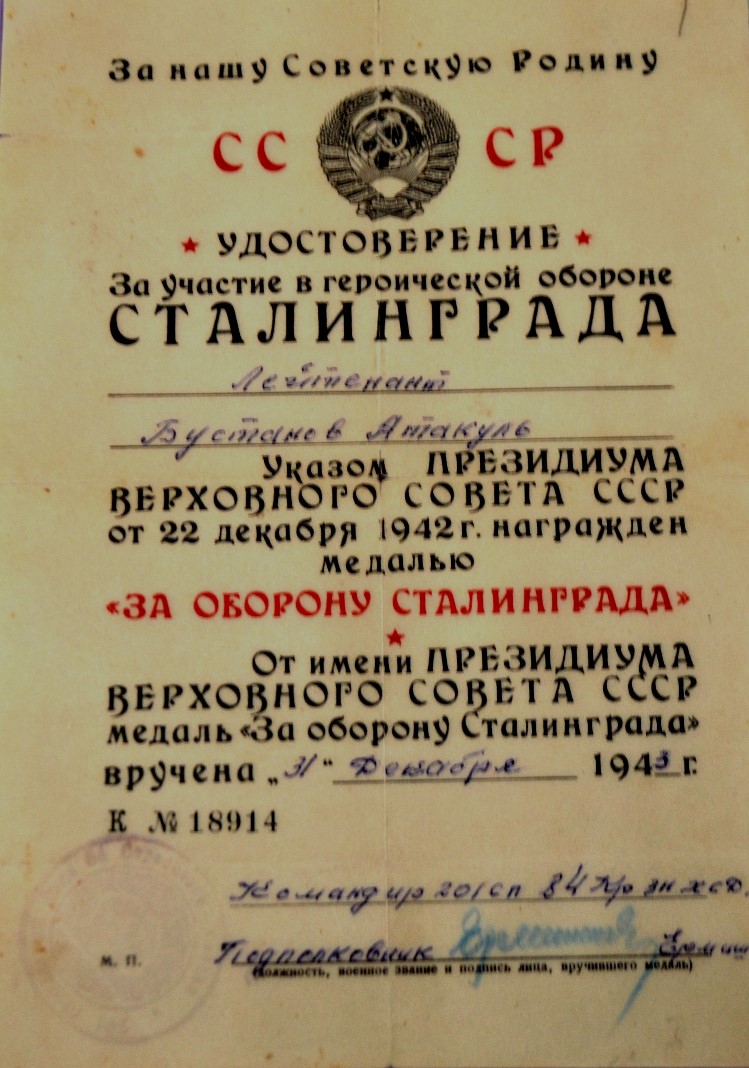 За героическую оборону Сталинграда лейтенант Отакул Бустонов был награжден медалью и орденом Красной Звезды. Однако дороже всех наград для него является одно письмо.