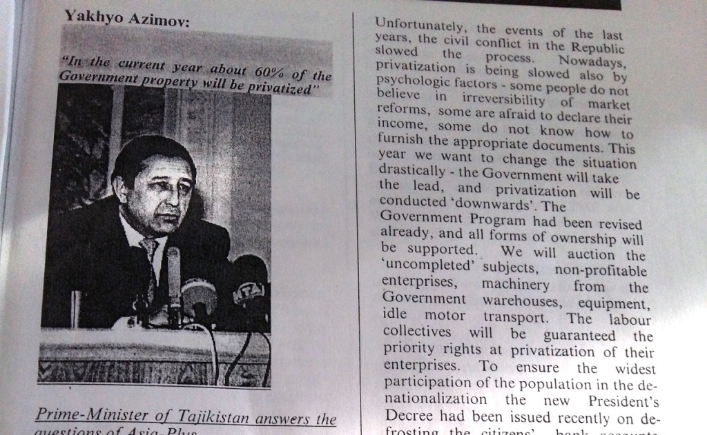 В рубрике «Власть» своё первое интервью «Азии-Плюс» дал премьер-министр Яхьё Азимов. Он рассказал нашим читателям, что в 1996 году правительство планирует ускорить процесс приватизации госсобственности – довести его с тогдашних 8 процентов до 50-60, создать дополнительные стимулы для иностранных инвесторов, укрепить национальную таджикскую валюту – таджикский рубль. Говоря о земельной реформе, премьер рассказал о раздаче 50 тысяч гектаров земли дехканам, о том, что уже в том же, 96-м году планируется отменить план по хлопку, а упор в развитии сельского хозяйства сделать не на колхозы и совхозы, а на фермерские хозяйства…