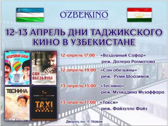 В течение двух дней в кинотеатрах Ташкента будут показаны художественные фильмы «Воздушный Сафар» Далера Рахматова, «Такси» Файзуллои Файза, «Сон обезьяны» Руми Шоазимова и «Теснина» Мухиддини Музаффара, сообщили «АП» в Минкультуры Таджикистана.