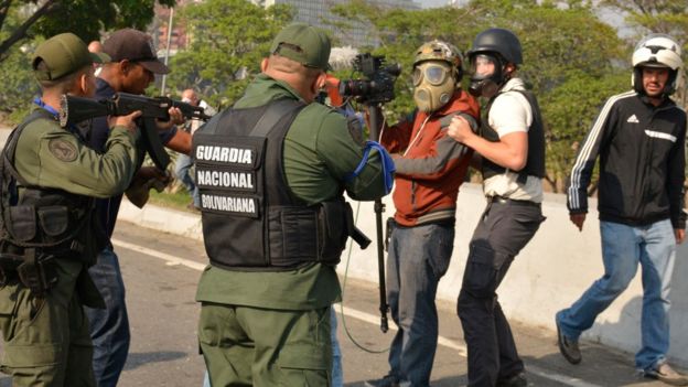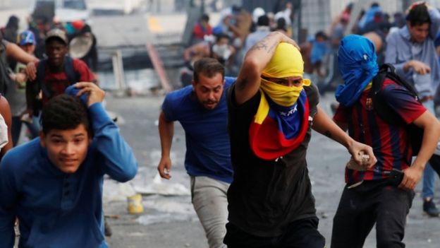 В городе продолжаются столкновения между сторонниками Гуайдо и военными, в распоряжении которых есть бронированные автомобили. Протестующие бросают камни, против них используют водометы и слезоточивый газ.