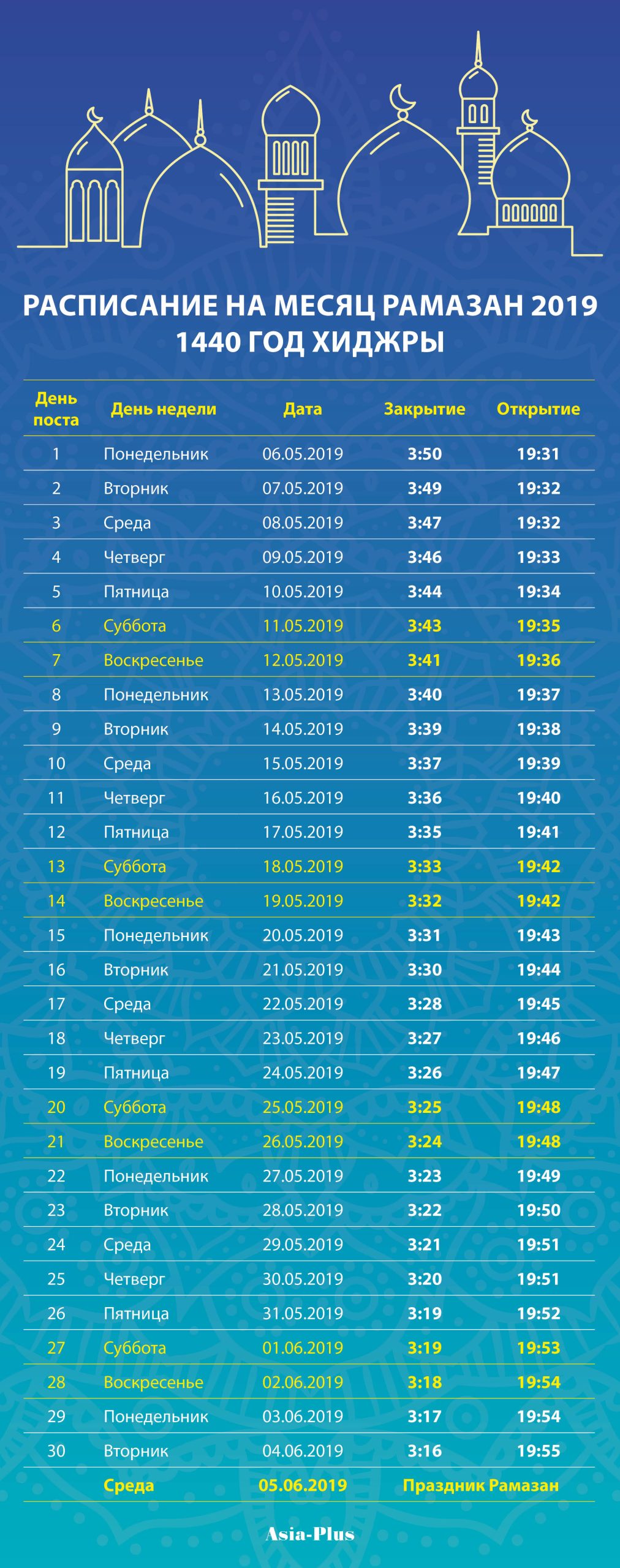 Пост в этом году будет длиться 30 дней: ночь с 5 на 6 мая — первый таровех-намаз, ночь могущества (Ляйлят-уль Кадр) придется на ночь с 31 мая на 1 июня, а завершится Рамазан праздником Ид аль-фитр или Иди Рамазон являющимся первым по значению праздником у мусульман, 5 июня.