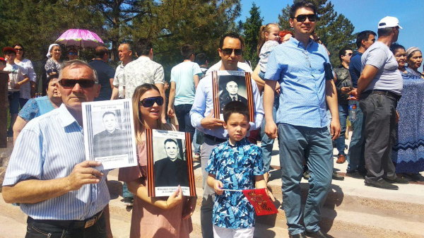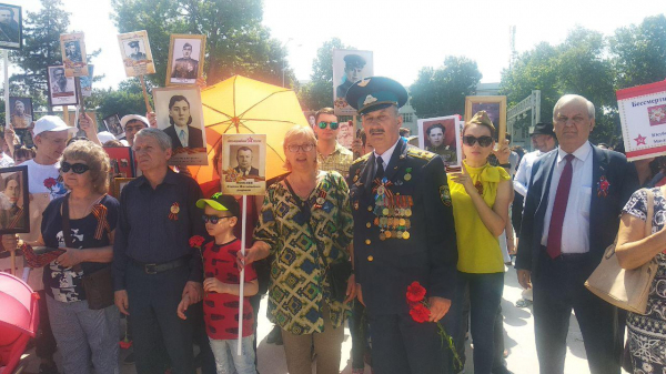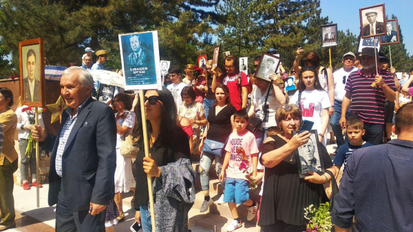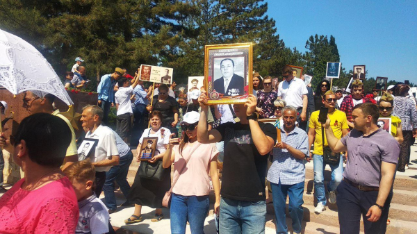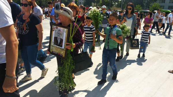 Однако и в этом году шествие ограничилось периметром мемориального комплекса "Братские могилы". Туда пришли сотни людей с портретами в руках. Они прошли этот крошечный путь по территории комплекса в память о подвиге своих предков, героически сражавшихся против фашизма.