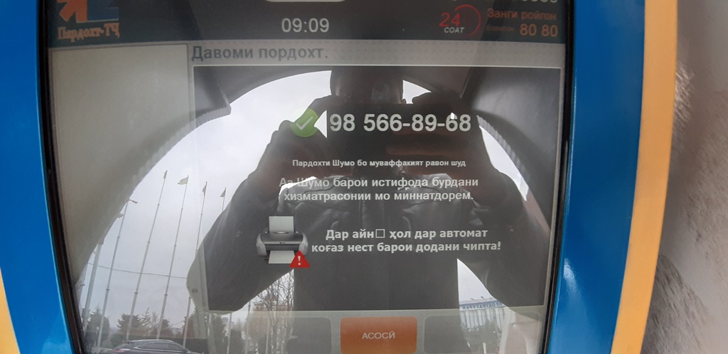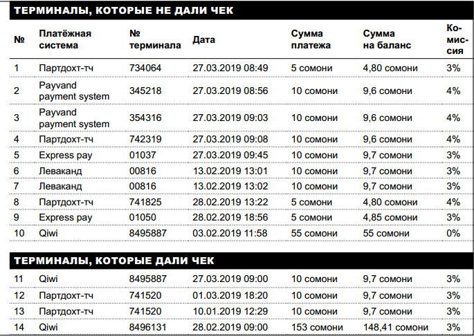 — В большинство платёжных терминалов не выдаются чеки. Но когда платёж не поступает на баланс, и ты звонишь в службу поддержки, спрашивают номер чека, банкомата и так далее – говорит Фирдавс Турсунов, житель города Душанбе. — Иногда бывает, что ты случайно кладёшь деньги чужому номеру, как это докажешь без чека?