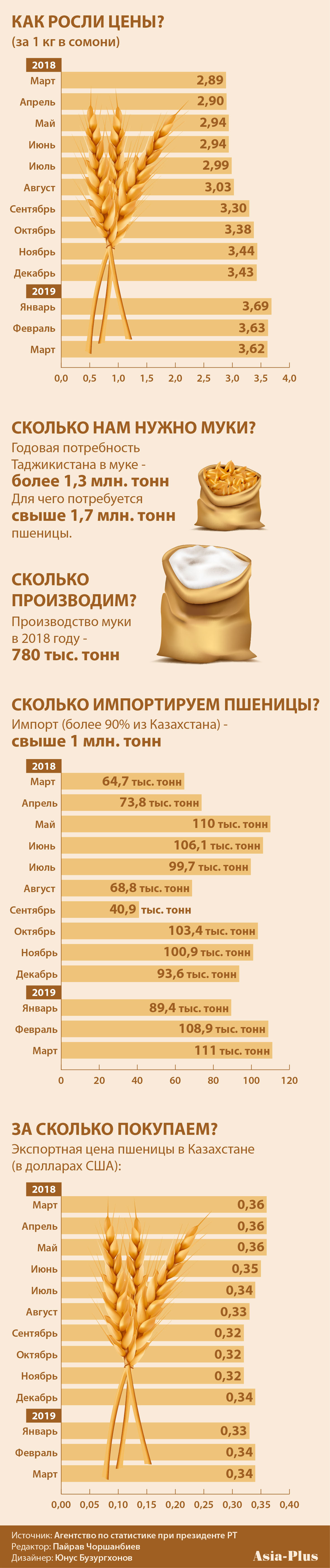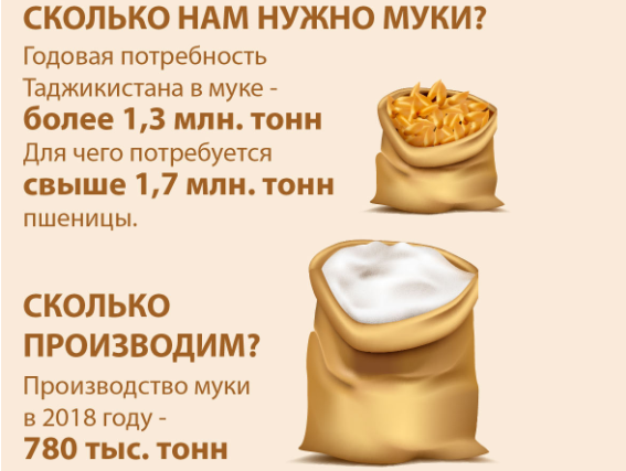 Мука 1-го сорта в Таджикистане с марта 2018 по март 2019 года подорожала на 25%.