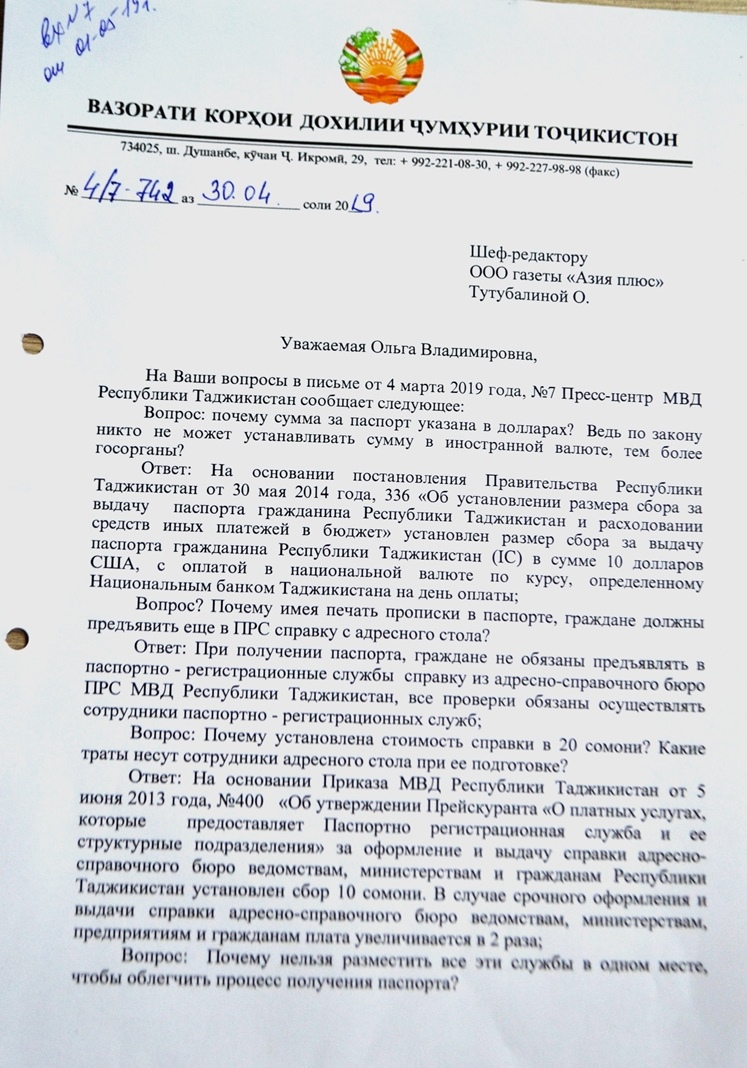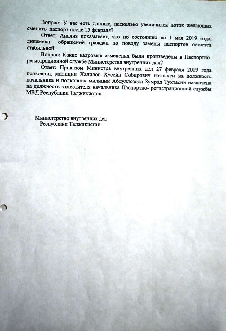 Свои вопросы в паспортно-регистрационную службу МВД мы отправили два месяца назад, но ответ получили только сейчас и в письменном виде. Мы не знаем, кто именно отвечал на наши вопросы.
