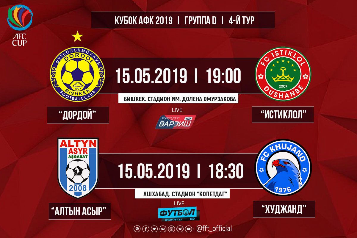 — Кубок АФК-2019 по футболу. Группа «D». 4-й тур «Дордой» (Кыргызстан) – «Истиклол» (Таджикистан), «Алтын Асыр» (Туркменистан) – «Худжанд» (Таджикистан).
