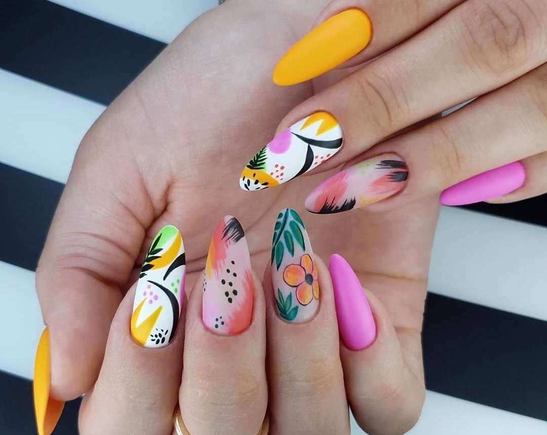 Очень красивый и необычный по сочетанию цветов дизайн ногтей, который по праву можно считать яркой новинкой года. Отличается такой маникюр на лето не только особым стилем рисунка, но и технологией выполнения. Сначала на ноготь наносится черная подложка, затем кистью и цветными гель-лаками прорисовываются разные элементы, а уже после этого те же самые оттенки лаков смешиваются с крупицами мелкой белой акриловой пудры и наносится объемный рисунок.