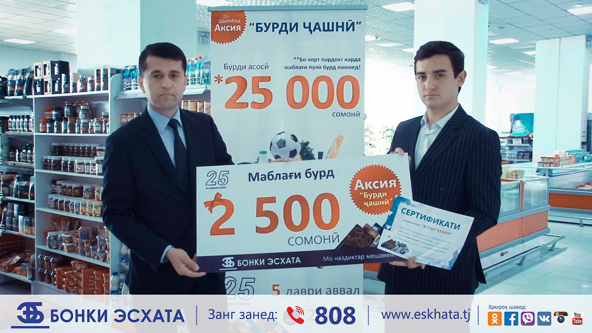 Чтобы стать участниками акции, оплачивайте покупки в точках торговли и услуг картами Банка Эсхата. Минимальная сумма оплаты 25 сомони, количество ID номеров равна количеству произведенных платежей.