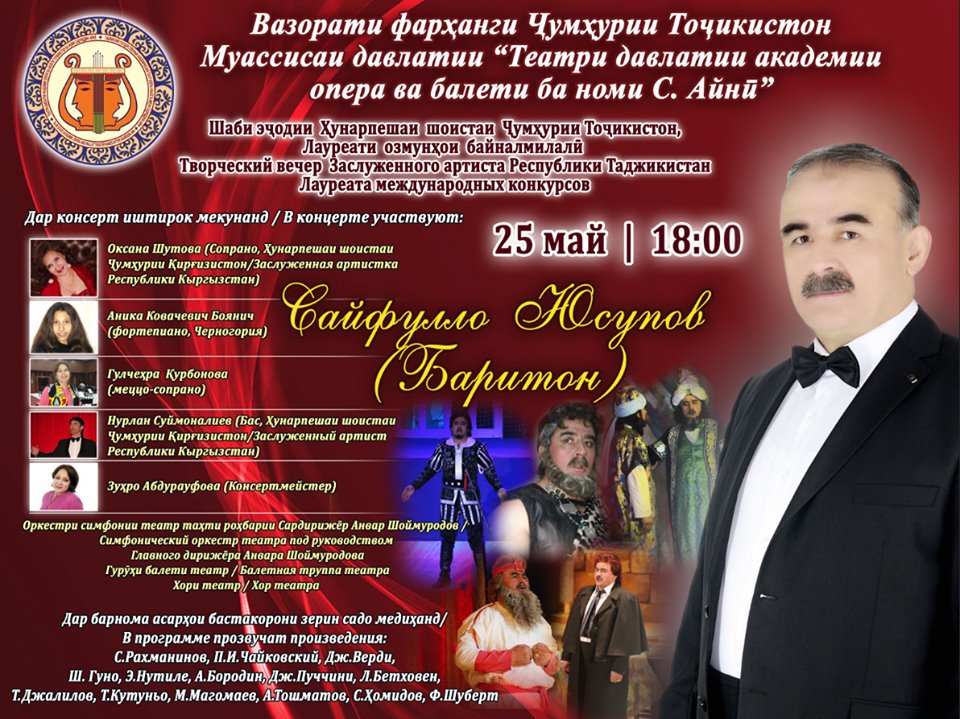 — В Таджикском академическом театре оперы и балета в 18:00 состоится творческий вечер Заслуженного артиста Таджикистана, Лауреата международных конкурсов Сайфулло Юсупова.