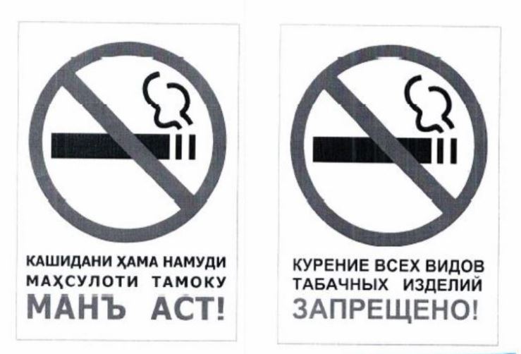 Образцы рекомендуемых знаков для общественных мест, оповещающих о запрете курения также утверждены министерством здравоохранения и соцзащиты. В соответствии с нормативами, ширина изображения на них должна быть не менее 13 сантиметров, а сам диаметр круга должен составлять не менее 20 сантиметров.