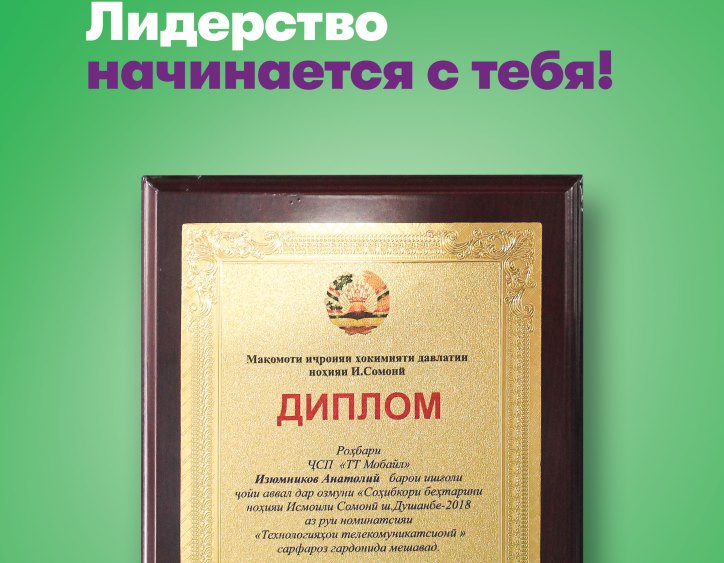 МегаФон Таджикистан получил новую награду: Исполнительный директор компании Анатолий Изюмников признан руководством района Исмоили Сомони города Душанбе лучшим предпринимателем в номинации «Телекоммуникационные технологии». Диплом подписан исполняющим обязанности председателя района Сами Шарифом.