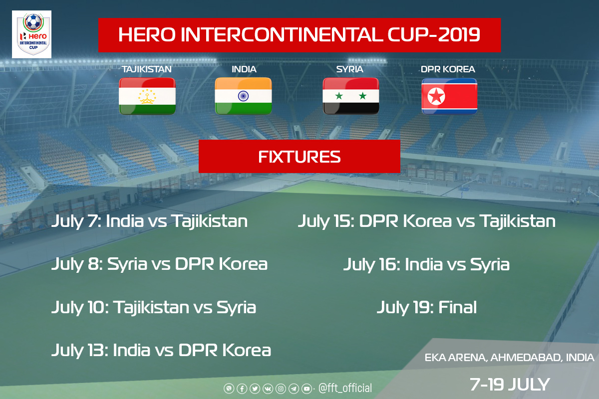 Стал известен календарь игр международного футбольного турнира «Hero Interсontinental Cup 2019», который пройдет с 7 по 19 июля в индийском городе Ахмадабад с участием национальных сборных Таджикистана, Сирии, КНДР и Индии.