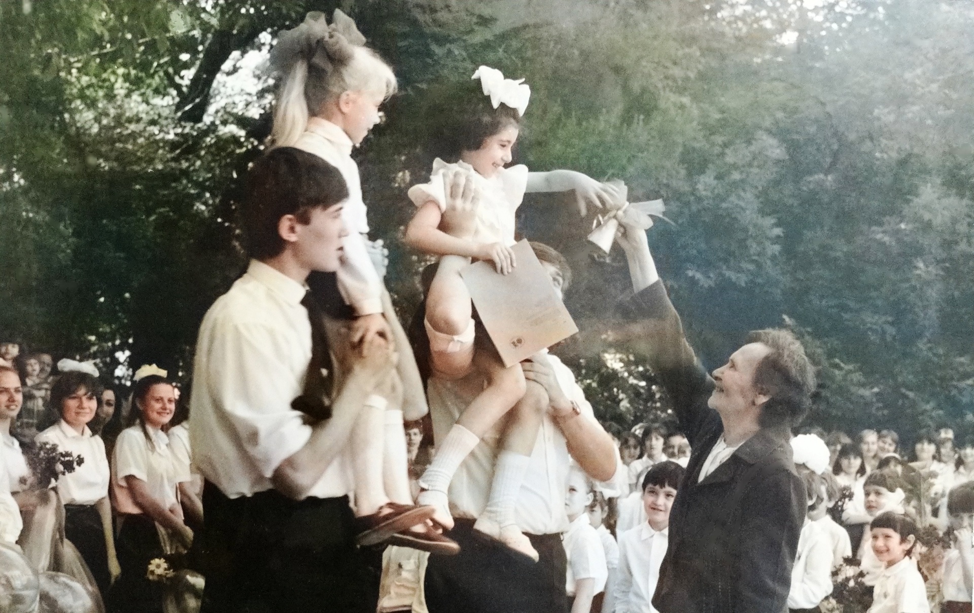 А еще все наши мамы и папы были  вместе с нами на площади от заката  до самого рассвета… Белые рубашки, школьные фартуки и красные ленты — расписанные самыми искренними пожеланиями от одноклассников и совсем незнакомых выпускников других школ. Песни под гитары и самые чистые слёзы…