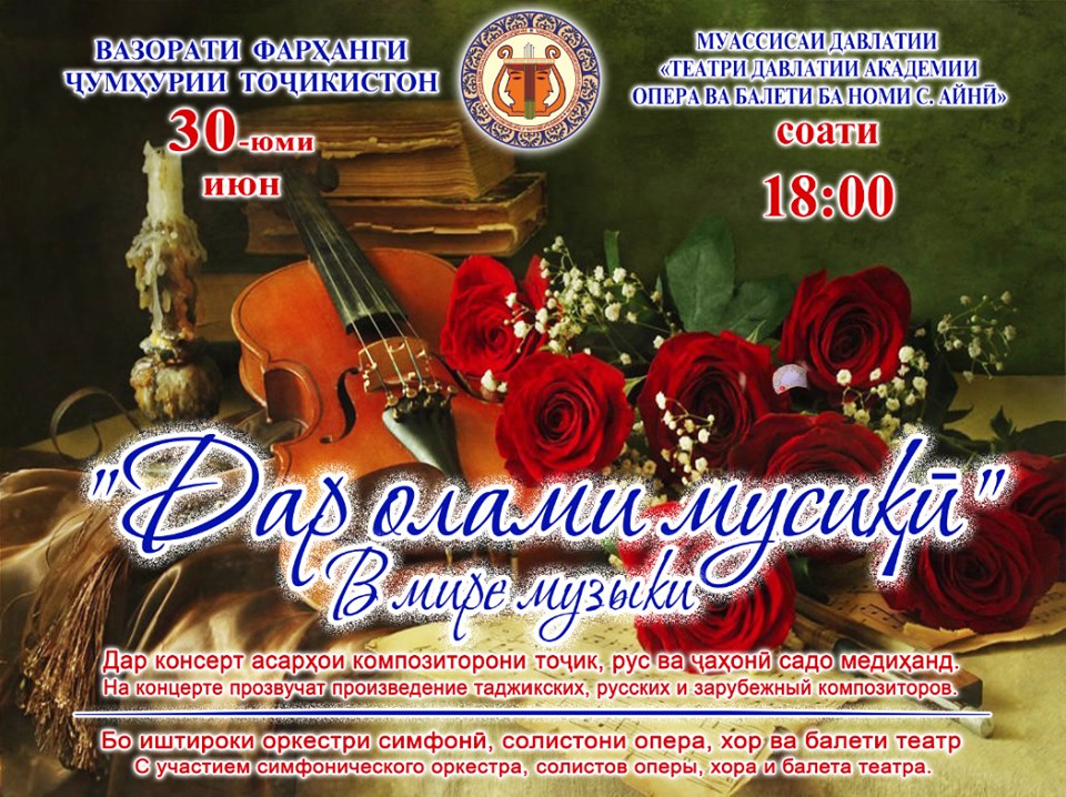 В эти дни все уходят на летние каникулы, и даже театры. Таджикский государственный академический театр оперы и балета им. С.Айни 30 июня в 18:00 закрывает свой 78-ой театральный сезон концертом "В мире музыки" с участием симфонического оркестра, солистов оперы, балета и хора. В концерте прозвучат произведения таджикских, русских и зарубежных композиторов! Подробная информация по телефону 221 62 91 или на сайте www.operabalet.tj Билеты продаются ежедневно в кассе театра с 09:00-17:00.