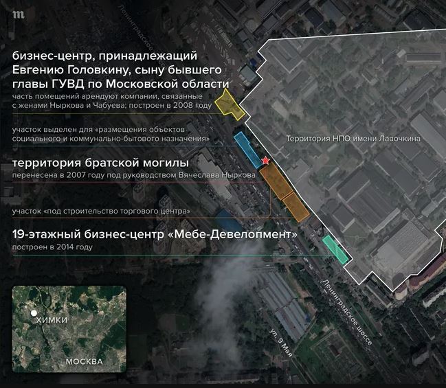 Спустя год после перезахоронения в нескольких сотнях метров от бывшей братской могилы построили офисный центр, принадлежащий Евгению Головкину — сыну тогдашнего начальника ГУВД Московской области (2001–2014) Николая Головкина. В бизнес-центр помимо прочих въехали компании, на тот момент принадлежавшие жене Вячеслава Ныркова — директора похоронной службы Химок и человека, который руководил работами по перезахоронению останков из братской могилы.