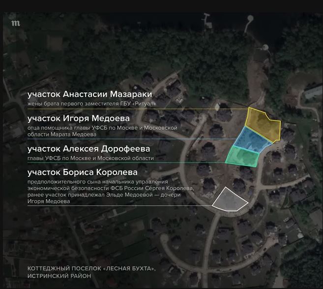 Семьи Мазараки и Дорофеева тоже могут быть знакомы. Участки Дорофеева, Медоева и Мазараки соседствуют друг с другом и фактически образуют отдельную улицу. На этой же улице располагается участок, до недавнего времени принадлежавший дочери Игоря Медоева (и сестре Марата Медоева) Эльде, но в 2018 году она его продала. Согласно выписке из Росреестра, полученной 12 июня 2019-го, покупателем участка стала «Российская Федерация». Однако в более ранних выписках указано, что покупателем был Борис Сергеевич Королев. Его имя, отчество и фамилия полностью совпадают с данными сына Сергея Королева — начальника СЭБ ФСБ России. Как и Алексей Дорофеев, Сергей Королев начинал карьеру в петербургском управлении госбезопасности; как и Игорь Медоев, он работал помощником министра обороны Сердюкова. Знакомый Медоевых утверждает, что покупателем участка действительно выступал сын высокопоставленного сотрудника ФСБ. Эльда Медоева отказалась ответить на вопросы «Медузы».