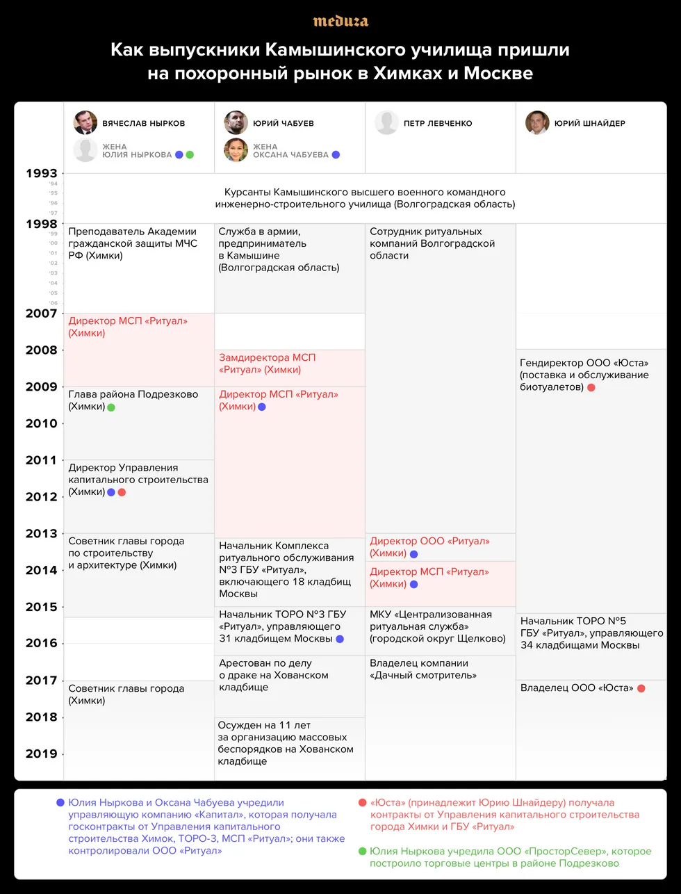 Два года спустя ТОРО № 3 расширилось — в него включили ряд знаменитых московских кладбищ, в том числе Троекуровское, Ваганьковское и Новодевичье, — и стало крупнейшим подразделением ГБУ «Ритуал». Под контролем Чабуева оказалось 31 кладбище, включая самые престижные. Однокашник Чабуева и бизнес-партнер по «Чистому городу» Юрий Шнайдер вскоре возглавил ТОРО № 5, включающее еще несколько крупных кладбищ на юге Москвы — Щербинское, Домодедовское, Котляковское. Таким образом, выпускники Камышинского училища из Волгоградской области распространили свое влияние на лучшие кладбища Москвы.