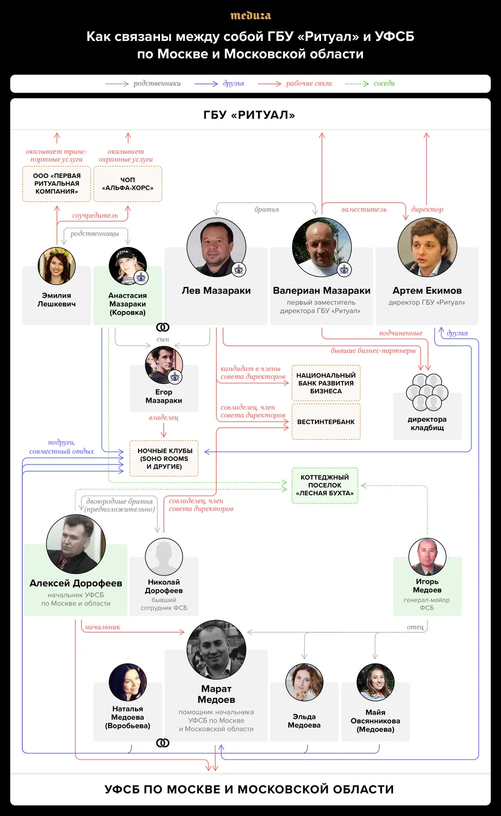 Сведения о том, что именно генерал Дорофеев стоял за назначением Артема Екимова главой московского ГБУ «Ритуал», подтвердил источник «Медузы» в правоохранительных органах. Офицер одной из спецслужб, лично знакомый с Маратом Медоевым, рассказал «Медузе», что Екимов считался «человеком Дорофеева».