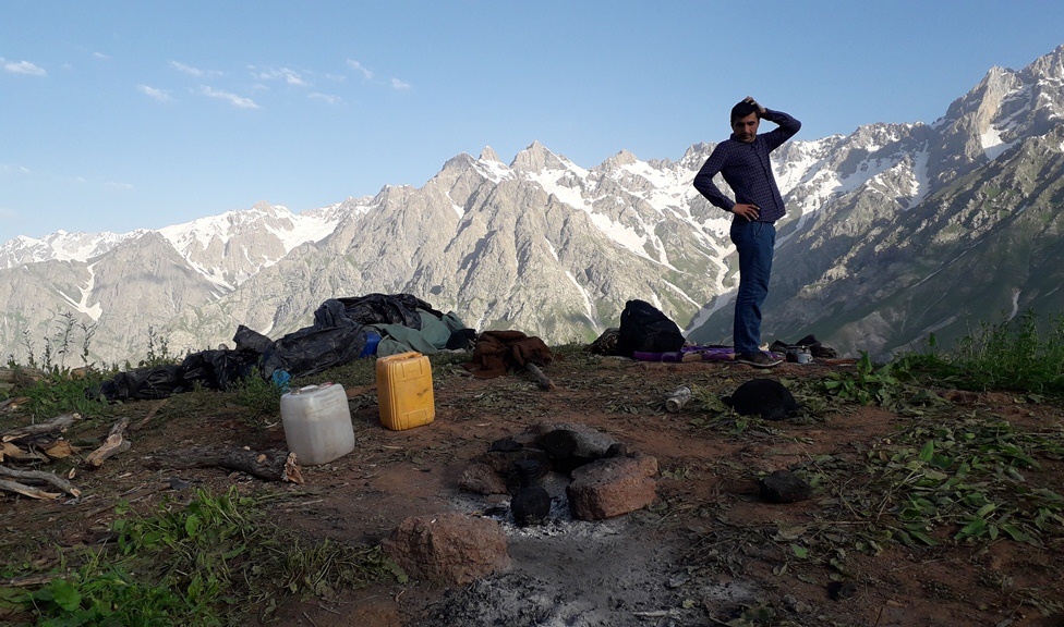 Лагерь чабанов расположен на вершине. Стоянку они разбили тут, чтобы контролировать все пастбище. Чабаны говорят, в расщелине, где нет ветра, уютно, но опасности больше. К примеру, медведи на вершину не лезут.