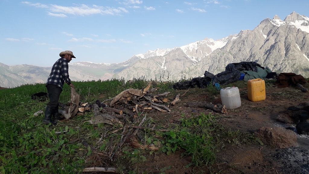 Стоянка чабанов. Она временная, кочует за отарой. Здесь чабаны готовят, спят, стирают. Каждая смена (продолжительность от 15 дней до 1 месяца) привозит с собой провизию. Это – мука для изготовления лепешек, соль, сладости, иногда какие-то овощи и фрукты. Рацион в основном состоит из мяса и чалоба (из овечьего и козьего молока). Лепешку готовят двумя способами – в казане или на специальной сковородке. Добавляют джаззу и получается отличный «кумоч» — лепешка, испеченная под золой в сковородке или фольге.