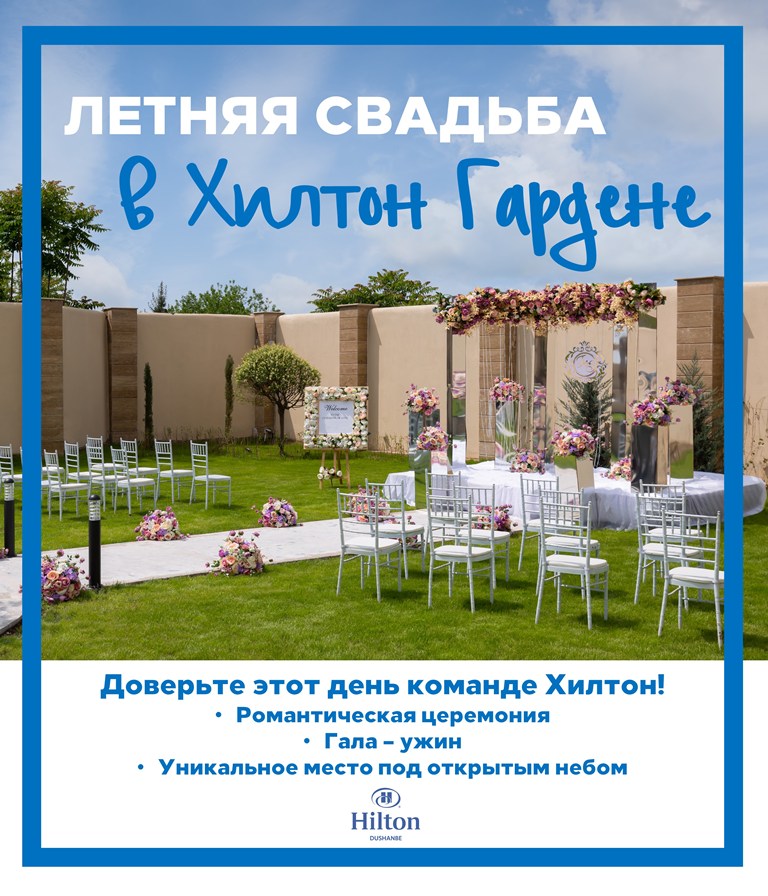Вместе с новым садом Hilton принес новый для Таджикистана тренд и успешно внедрил его в сферу услуг гостиничных комплексов. Это проведение свадебных торжеств на открытом воздухе, о котором наши женихи и невесты раньше могли только мечтать. Одна свадьба не должна быть похожей на другую, она должна быть яркой, необычной, запоминающейся, но в тоже же время весьма скромной по расходам. Концепция рассчитана на всех, чтобы каждый имел возможность провести незабываемую свадебную церемонию.
