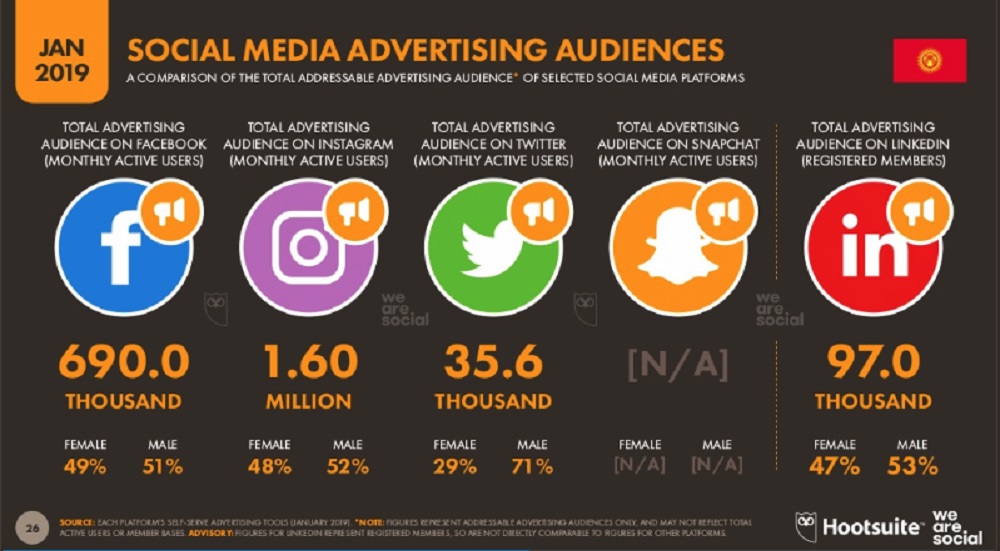 По данным портала, число активных пользователей Facebook в 2019 году в Кыргызстане составляет 690 тыс., а Instagram 1,6 млн человек.
