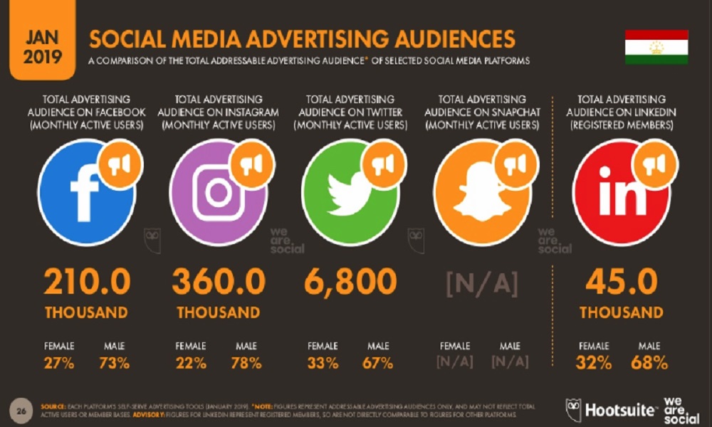 По данным доклада «DIGITAL 2019», большинство пользователей социальных сетей в Таджикистане — мужчины.