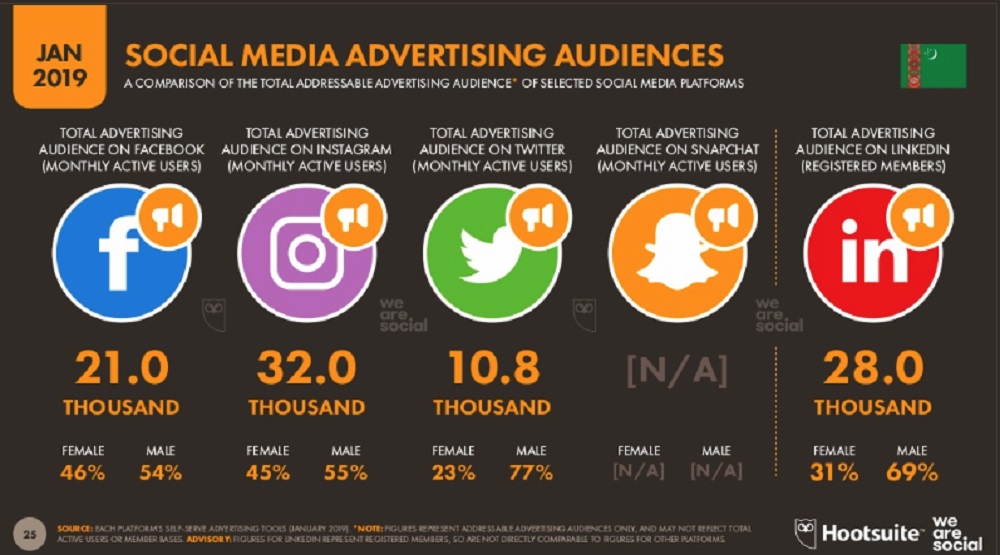 По данным DataReportal, в Туркменистане чуть более 1 млн. активных пользователей интернета, соответственно, количество пользователей социальных сетей тоже небольшое.