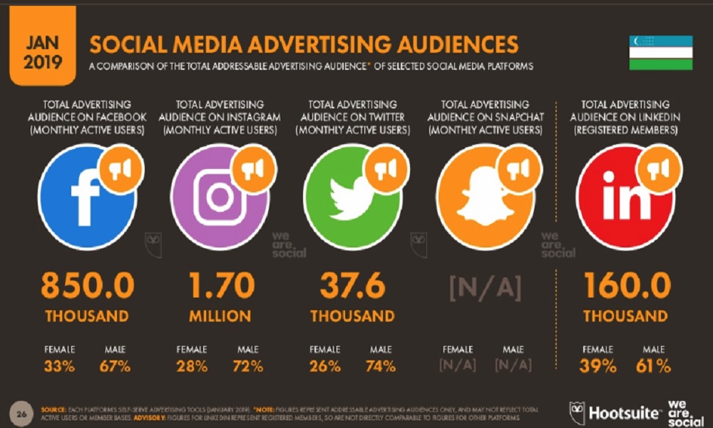 В Узбекистане с социальными сетями такая же ситуация, как в Таджикистане, правда, количество пользователей больше за счёт численности населения. Согласно докладу «DIGITAL 2019», в Узбекистане тоже на первом месте находится Instagram с 1,7 млн. активными пользователями.