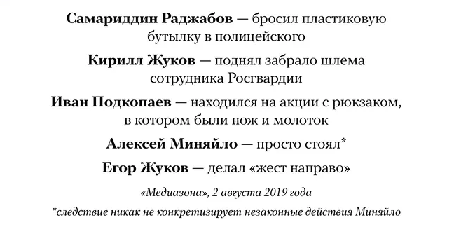 Как сообщает «Настоящее Время», 21-летний Самариддин Раджабов, уроженец Таджикистана, участвовал в акции 27 июля, был арестован по административной статье. Но, при этом обвиняется в участии в массовых беспорядках (по статье 212-й часть 2 грозит лишение свободы до восьми лет).