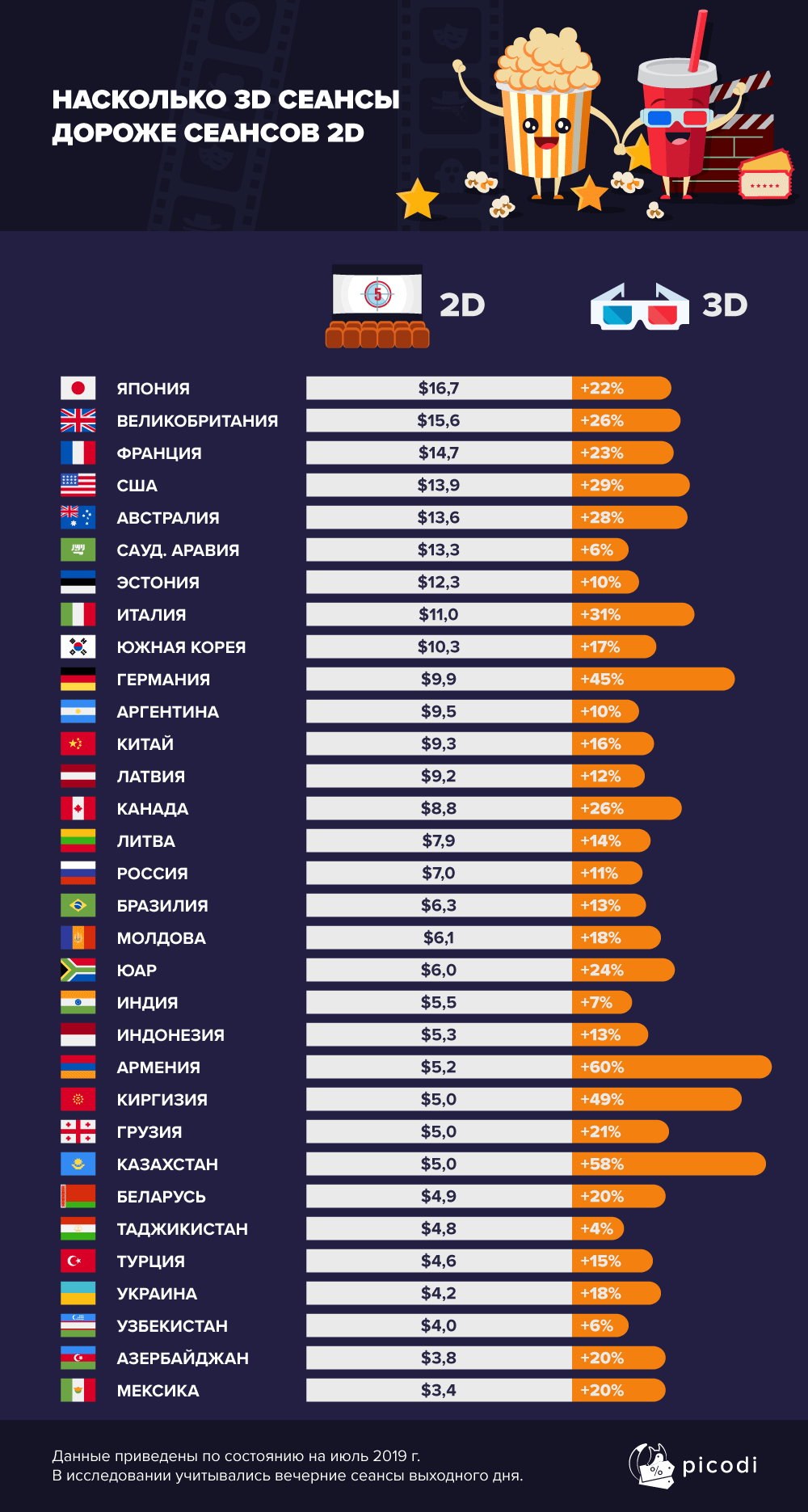 В разгар летнего кинотеатрального сезона, полного премьер портал Picodi.com решил проанализировать, насколько отличаются цены на 2D и 3D сеансы по будням и выходным в кинотеатрах стран Европы и Азии.