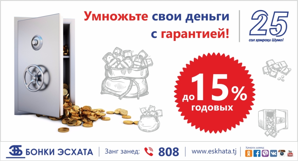 Вложите свои деньги в депозитные продукты Банка Эсхата и гарантированно их умножьте! На Ваш выбор 6 депозитных продуктов до 15% годовых в валюте сомони.