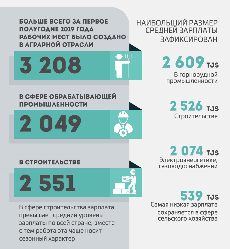 По данным Агентства по статистике при президенте Таджикистана, в первой половине 2019 года в республике было создано более 14,5 тысяч новых рабочих мест. Из них 9 тысяч являются постоянными, более 3 тысяч временными и 818 — сезонными. Кроме того, введено 233 дополнительных и восстановлено 1,5 тыс. рабочих мест.