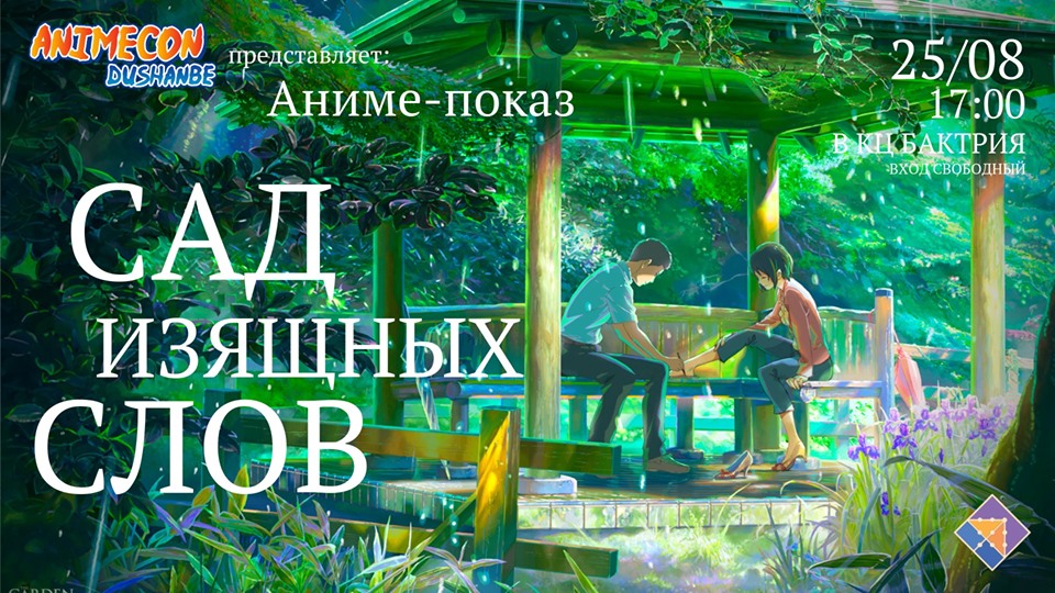 Еще один фильм – анимационный — можно будет посмотреть в воскресенье в в Культурном Центре Бактрия. В 17:00 там состоится показ 45-минутного анимационного фильма «Сад Изящных Слов» от Animecon Dushanbe. Вход свободный. Подробности по телефонам: +992915858305, +992777106200