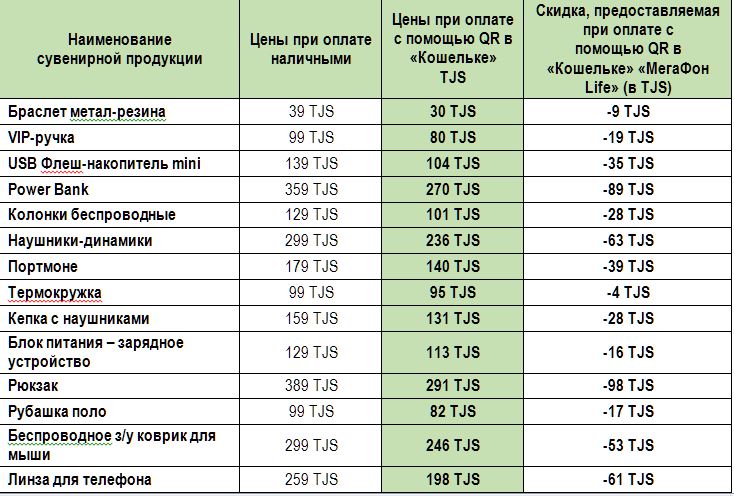 Компания «МегаФон Таджикистан» запускает специальную акцию для пользователей услуги «Кошелек» в мобильном приложении «МегаФоне Life». Абоненты оператора, которые используют для оплаты QR, могут приобрести сувенирную продукцию с существенной скидкой – до 98 сомони. Акция проводится в офисах обслуживая компании на Рудаки, 89 и в «Ашане» по 31 декабря включительно.