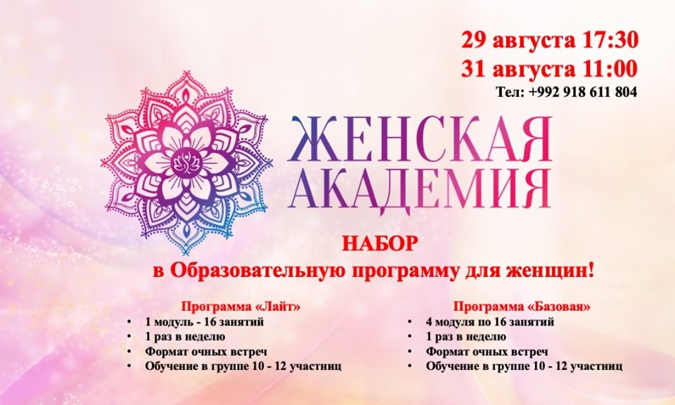 В субботу начинается набор в Женскую Академию в Душанбе! Женская Академия – это уникальные тренинги для женщин и девушек! В это раз набор идет сразу в 2 программы — «Лайт» и — «Базовая». Обучение в Женской Академии позволяет раскрывать свою эмоционально-чувственную природу и познать свои истинные потребности. Записаться на презентации можно по телефону 918 611 04.