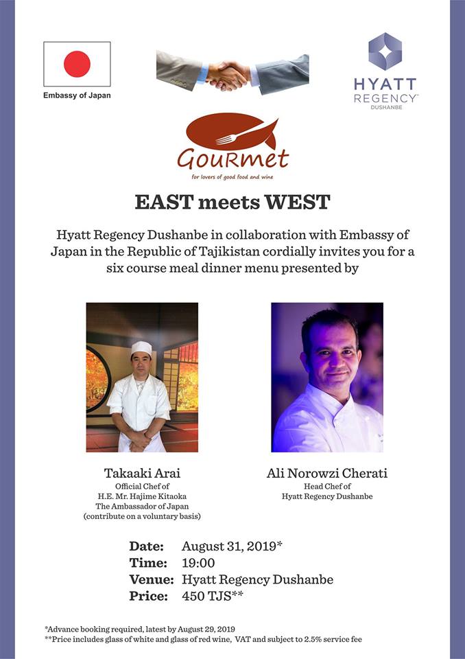 А любителей хорошей еды и вина на вечер приглашает Hyatt Regency Dushanbe. Изысканное сотрудничество двух опытных шеф-поваров украсит ваш вечер и побалует ваш аппетит ужином из 6 блюд в атмосфере комфорта и музыки. Не пропустите этот уникальный вечер 31 августа в 19:00. Стоимость: 450 сомони
